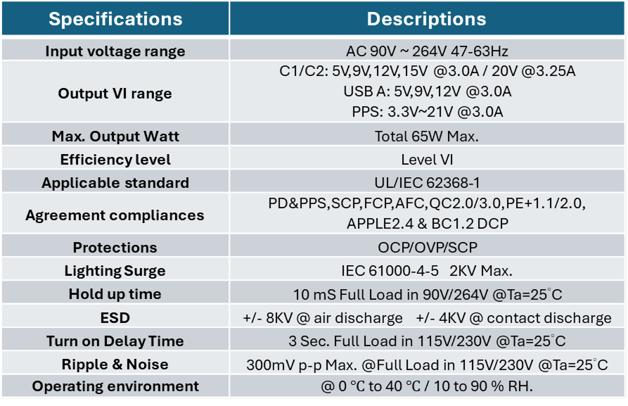 ◼︎ Compliance: PD&PPS、SCP、FCP、AFC、QC2.0/3.0、PE+1.1/2.0、APPLE2.4 & BC1.2 DCP